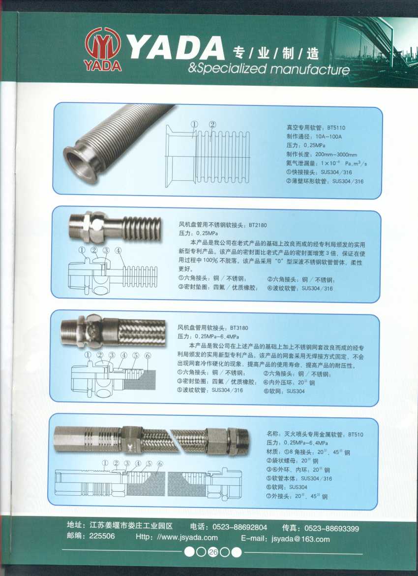 秉天時 籍地利 仰人和 虔誠一個永恒的理念,創(chuàng)新永續(xù).百諾不如一信,亞達人堅持以信為本,視客戶如同上帝,把對信譽的追求,體現在嚴格的質量控制和完善的客戶服務上,讓客戶百分之百滿意是亞達人不變的信念。 本廠系ISO9001質量認證企業(yè)、計量合格企業(yè)。本廠專業(yè)致力于生產不銹鋼金屬波紋軟管、超高壓、高壓膠管、波紋管補償器(膨脹節(jié))、立式、臥式、冷卻器。本廠產品具有承受壓力高、彎曲半徑小、抗疲勞性能強、使用壽命長等特點。廣泛應用于電力、石化、冶金、水泥建材、工程機械、礦山及液壓系統(tǒng)。產品暢銷全國各地。 今日亞達之成功源自諸多客戶的厚愛,明天的輝煌更離不開您對我的支持與信賴。查看更多>>